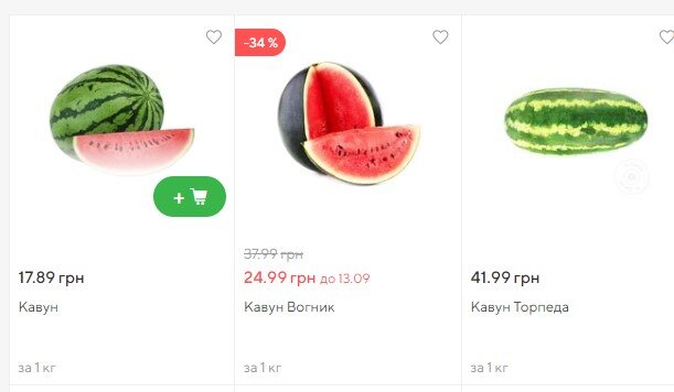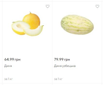У Новус вартість дині стартує від 64,99 грн/кг та сягає 79,99 грн/кг.