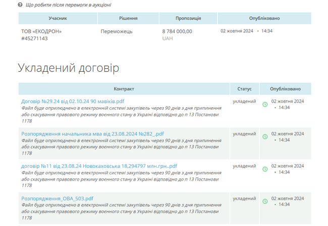 Щодо постачальника, за данними аналітичної системи Youcontrol компанія "Екодрон" зареєстрована вкінці листопада 2023 року. Власником зазначена мешканка одеської області Ауріка Довгалюк. Основним видом діяльності ТОВки зазначена роздрібна торгівля, що здійснюється фірмами поштового замовлення або через мережу інтернет. Не дивлячись, що на ринку компанія перебуває лише 10 місяців вона вже встигла укласти 131 угоду на загальну суму 139,7 мільйона гривень.