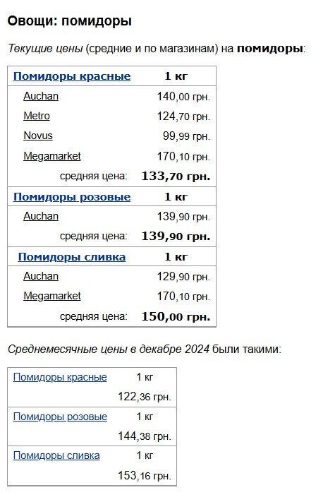 У сегменті помідорів спостерігається загальне зростання цін. Червоні помідори подорожчали з 122,36 до 133,70 грн за кілограм, при цьому розкид цін у магазинах досить суттєвий – від 99,99 грн у Novus до 170,10 грн у Megamarket. Рожеві помідори трохи знизилися в ціні – з 144,38 до 139,90 грн, а помідори вершка трохи подешевшали – з 153,16 до 150,00 грн за кілограм.
