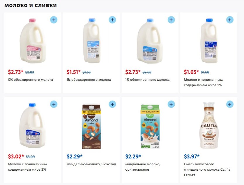 Вартість знежиреного молока стартує від 1,51 доларів (62.51 грн) і досягає 3,02 доларів (125.03 грн).