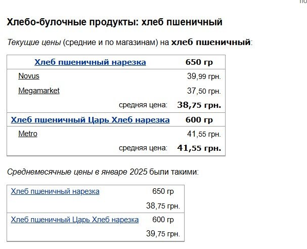Хлібобулочні вироби представлені переважно двома позиціями: класичний пшеничний хліб нарізний вагою 650 грамів із середньою ціною 38,75 гривень і "Цар Хліб" нарізний 600 грамів за ціною 41,55 гривень. Цікаво відзначити, що порівняно з січневими показниками 2025 року ціна на "Цар Хліб" дещо знизилася - з 39,75 до поточних 41,55 гривень за буханець.