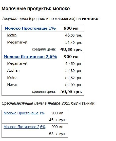 Вартість молока залишається відносно стабільною: Простоквашино 1% жирності в упаковці 900 мл можна придбати в середньому за 48,89 гривень, а молоко "Яготинське" 2,6% жирності того ж об’єму - за 50,95 гривень. Примітно, що в мережі Megamarket молоко "Яготинське" продається за найнижчою ціною - 45,50 гривень.