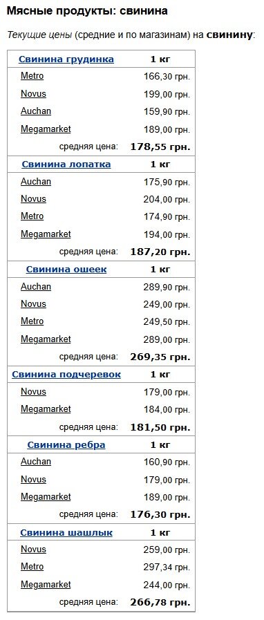 Щодо свинини, найбільш доступним сортом залишаються ребра із середньою вартістю 176,30 гривень за кілограм. Водночас ошийок виявився значно дорожчим - у середньому 269,35 гривень за кілограм, що робить його найдорожчим серед усіх представлених видів свинини. Для любителів шашлику середня ціна становить 266,78 гривень за кілограм, причому найвигіднішу пропозицію можна знайти в Megamarket - 244 гривні. Грудинку можна придбати в середньому за 178,55 грн/кг, а лопатку – 187,20 грн/кг.