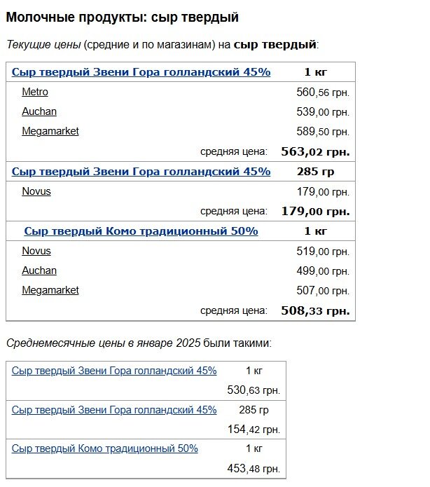 У сегменті молочної продукції особливої уваги заслуговує сир "Звени Гора голландський" 45% жирності, середня ціна якого досягла 563,02 гривні за кілограм. Доступнішою альтернативою є сир "Комо традиційний" 50% жирності із середньою ціною 508,33 гривні за кілограм.