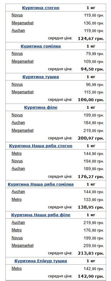 Цікаво, що стегно "Наша Ряба" практично не змінилося в ціні: 176,27 грн зараз проти 176,56 грн у квітні, при цьому найдешевше воно в Metro – 144,90 грн.Однак гомілка "Наша Ряба" суттєво подорожчала – зі 110,30 грн до 138,95 грн, з найнижчою ціною в Metro (133,90 грн).