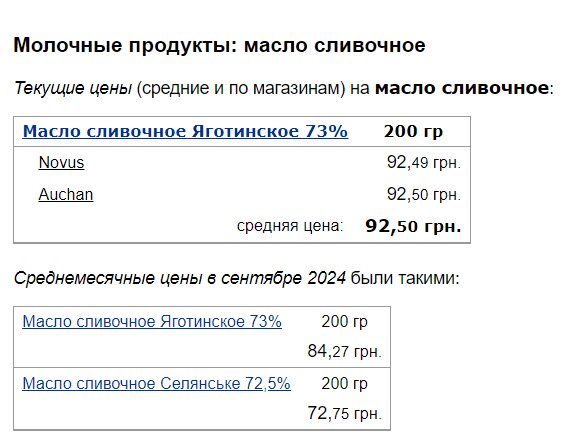 Вершкове масло також показує значний ціновий розрив. На ринку 180-грамове пакування масла 62% жирності коштує 54,60 грн. У порівнянні з цим, у супермаркетах 200 г масла 73% жирності оцінюється в 92,50 грн. Навіть з урахуванням різниці в обсязі та жирності, ціна в магазинах помітно вища.
