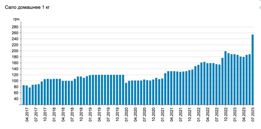 На прилавках середня вартість на солоне сало також зросла – до 262,70 грн/кг.Згідно з графіком середньомісячних цін, у липні спостерігається різкий стрибок ціни до рекордної (з 2017 року), а місяцем раніше – середня вартість становила 189,00 грн/кг.