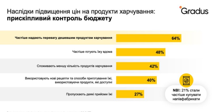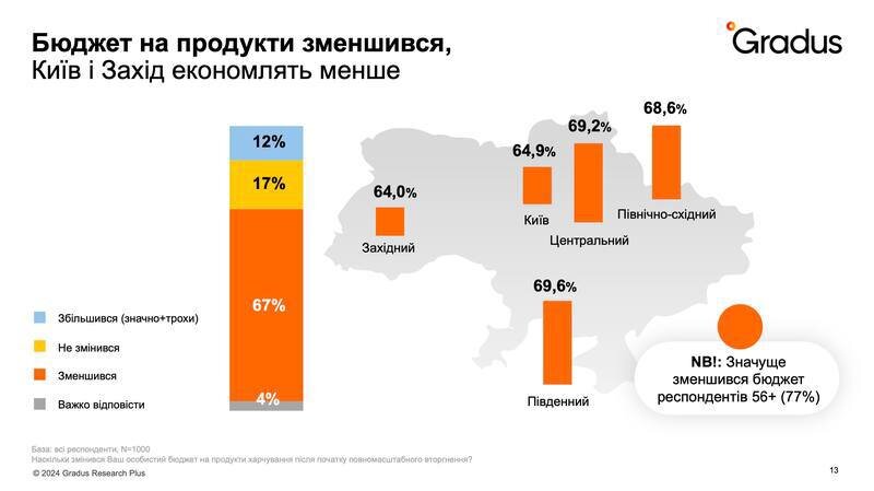 Зокрема, лише 17% опитаних зберегли колишній продуктовий бюджет, а 12% навіть змогли його збільшити. Проте переважна більшість – 67% – змушена заощаджувати на їжі.