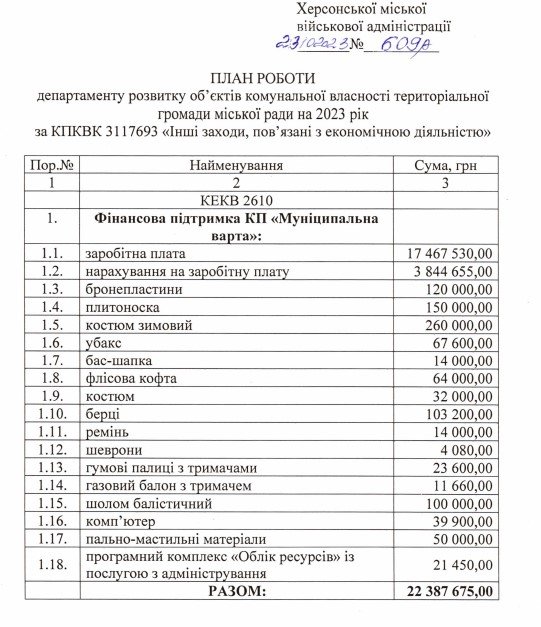 Очільник Херсонської МВА Роман Мрочко підписав розпорядження про затвердження оновленого плану робіт Департаменту розвитку об'єктів комунальної власності на 2023 рік. Зміни в плані стосуються комунального підприємства "Муніципальна варта", яке було створено у 2021 році за ініціативи тодішнього міського голови Ігоря Колихаєва та його оточення задля патрулювання Херсона та охорони об'єктів.