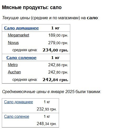 Щодо сала, то його ціни залишилися практично стабільними. Домашнє сало подорожчало всього на 1 гривню – з 232,93 грн до 234,00 грн за кілограм. А солоне сало навіть трохи подешевшало – з 248,34 грн до 242,84 грн за кілограм.