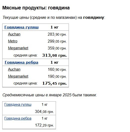 Зокрема, середня ціна на яловичину гуляш зросла із січневих 304,08 грн до 313,98 грн за кілограм. Яловичі ребра також незначно подорожчали – з 172,29 грн до 175,45 грн за кілограм.