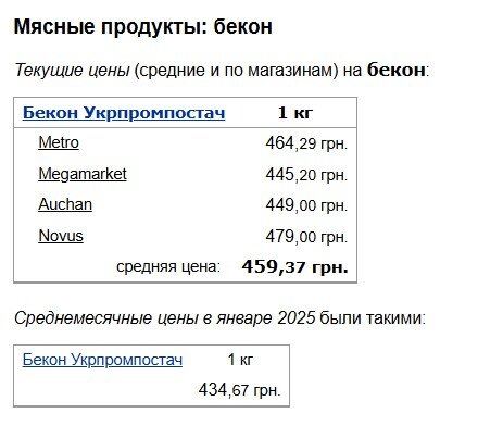 Більш помітне зростання цін показав бекон "Укрпромпостач" – його середня вартість збільшилася з 434,67 грн до 459,37 грн за кілограм. При цьому розкид цін у різних магазинах доволі значний: від 445,20 грн у Megamarket до 479,00 грн у Novus.