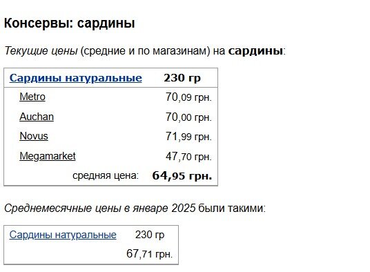 Що стосується сардин натуральних (230 г), тут ситуація дещо інша – середня ціна у лютому знизилася до 64,95 грн порівняно з січневою ціною 67,71 грн. При цьому спостерігається суттєвий розкид цін у різних торгових мережах: від 47,70 грн у Megamarket до 71,99 грн у Novus.
