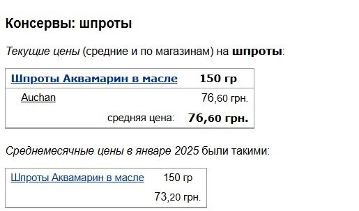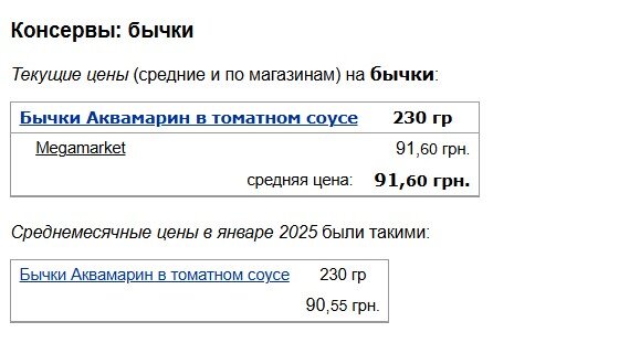 За даними моніторингу цін у великих торгових мережах, у лютому 2025 року спостерігається невелике зростання вартості рибних консервів порівняно із січнем. Зокрема, ціна на бички "Аквамарин" у томатному соусі (230 г) зросла з 90,55 до 91,60 грн.