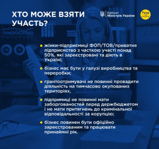 - підприємства (приватні, ФОП або ТОВ), зареєстроване та працюють в Україні та беруть участь переважно жінки – понад 50%;