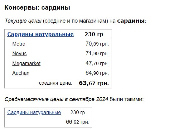 Ціни на сардини натуральні 230 г трохи знизилися – на 4,9%, з 66,92 грн до 63,67 грн.