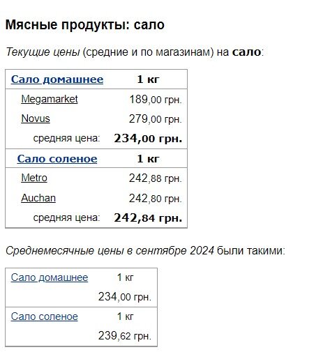 На особливу увагу заслуговує ситуація із салом – традиційним українським продуктом. Ціни на домашнє сало встановилися на рівні 234 грн за кілограм. Однак, зверніть увагу, що різниця між магазинами досягає майже 90 грн: від 189 грн у MeгaMaркeт до 279 грн у Новус. Солоне сало продається загалом по 242,84 грн за кілограм.