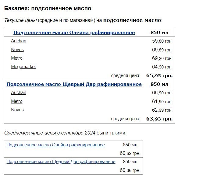 Зокрема, рафінована олія "Олейна" (850 мл) зараз продається в середньому по 65,95 грн.