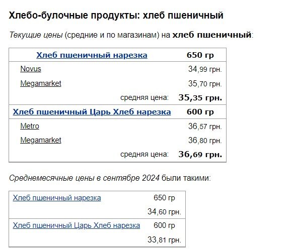 Хлібобулочні вироби також зазнали цінових змін. Стандартний пшеничний хліб у нарізці (650 г) зараз коштує в середньому 35,35 грн, а "Цар Хліб" (600 г) – 36,69 грн. Для порівняння, у вересні ціни були на рівні 34,60 грн та 33,81 грн відповідно.
