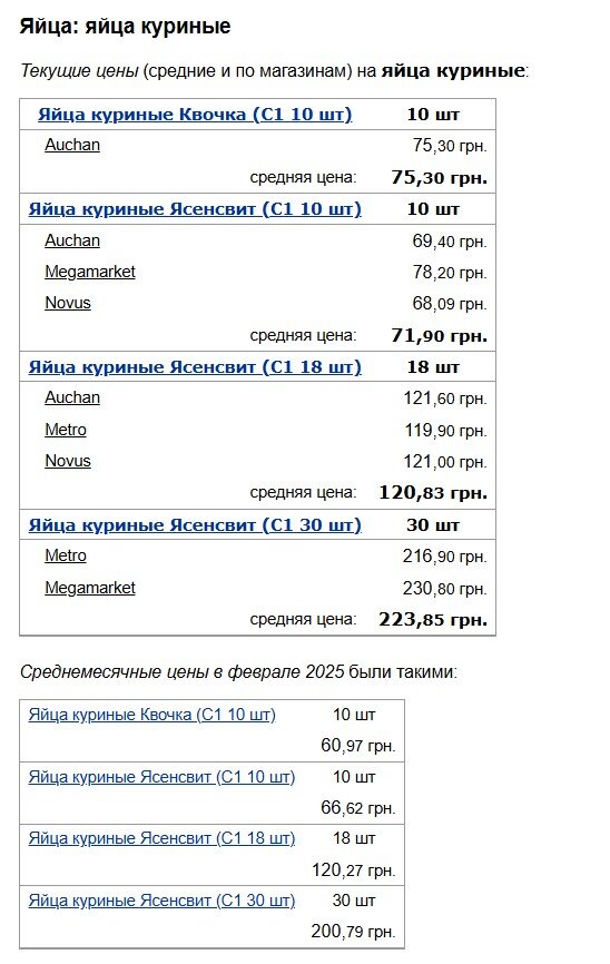 За даними моніторингу цін у великих торговельних мережах, курячі яйця марки "Квочка" (упаковка С1 10 штук) тепер коштують у середньому 75,30 грн, що на 23,5% вище за лютневу ціну, яка становила 60,97 грн. Яйця "Ясенсвіт" в аналогічній упаковці подорожчали з 66,62 грн до 71,90 грн, що означає зростання на 7,9%.