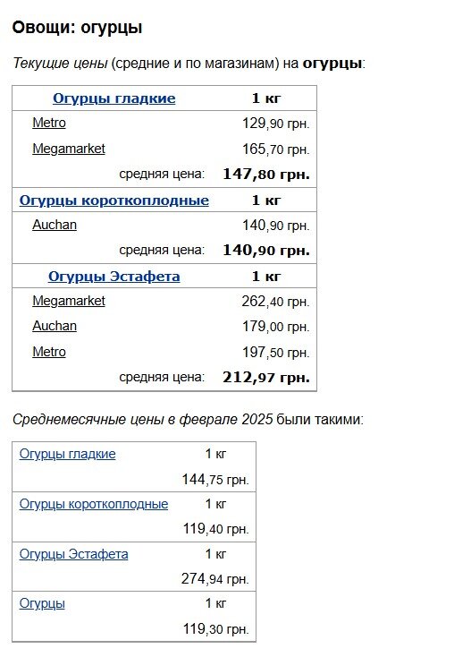 Ціна на гладкі огірки зросла зі 144,75 грн/кг до 147,80 грн/кг. Короткоплідні подорожчали зі 119,40 грн/кг до 140,90 грн/кг, а "Естафета" – з 119,30 грн/кг до 212,97 грн/кг.