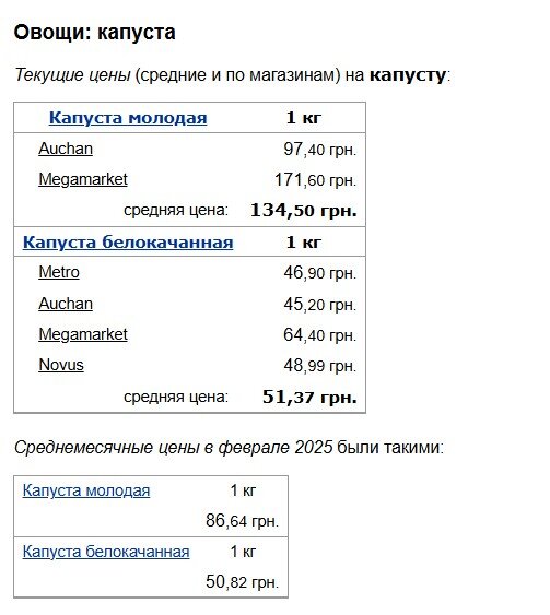 Зокрема, порівняно з минулим місяцем молода капуста в середньому подорожчала з 86,64 грн/кг до 134,50 грн/кг. А в "МегаМаркеті" за неї доведеться віддати аж 171,60 грн/кг. Дешевше обійдеться в "Ашані" – 97,40 грн/кг.