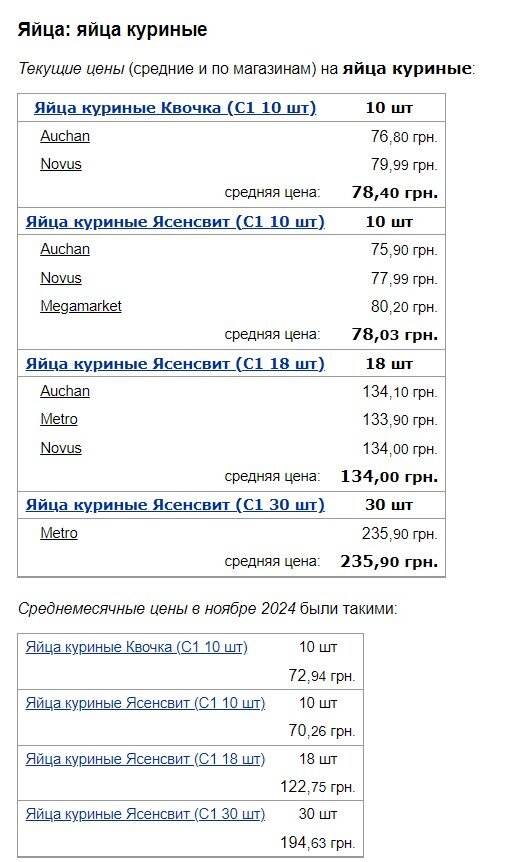 Зокрема, курячі яйця Квочка подорожчали з 72,94 грн до 78,40 грн за десяток. При цьому найдорожче вони обійдуться до Новуса – 79,99 грн. В Ашан можна віддати 76,80 грн за десяток. Ясенсвіт також подорожчали майже на 8 гривень, до 78,03 грн за десяток. За 30 штук таких самих яєць доведеться віддати 235,90 гривень (у листопаді було 194,63 грн).