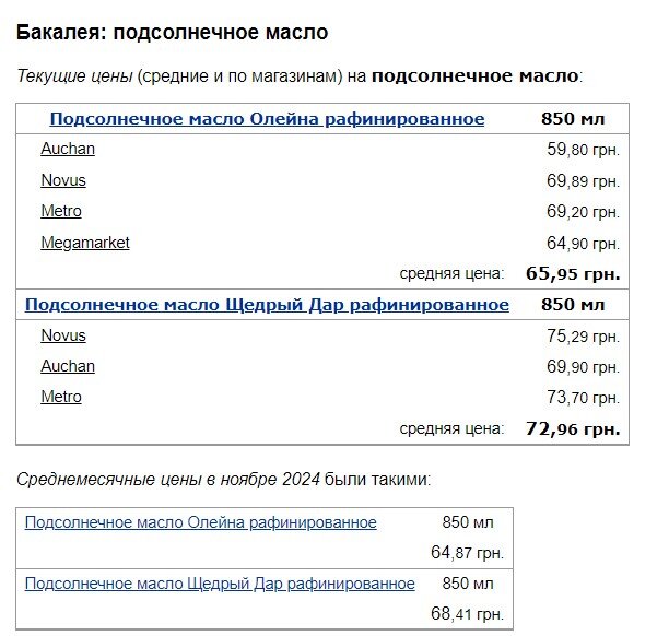 Підскочили ціни і на олію. Олейна рафінована підвищилася у ціні з 64.87 грн до 65,95 грн за 850 мл. Щедрий Дар рафіноване подорожчало з 68,41 до 72,96 грн за 850 мл.