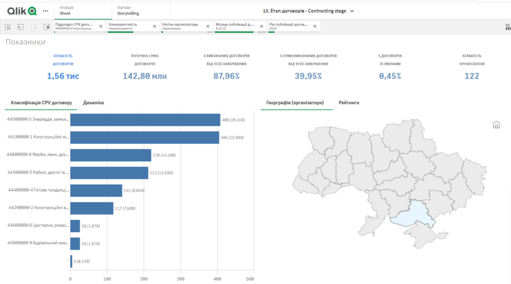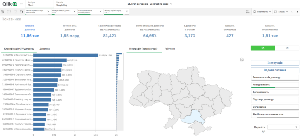 Попри те, що 8,5 місяців 2022 року Херсонщина майже повністю була окупована (перші звільнення громад почались у вересні 2022, правий берег повністю звільнили у листопаді 2022), а більша частина Херсонщини лишалась і лишається окупованою, за аналогічний період 2022 року (9 місяців) організаторів і постачальників торгів було більше, аніж у 2023-му. Хоча сума менша майже на мільярд.