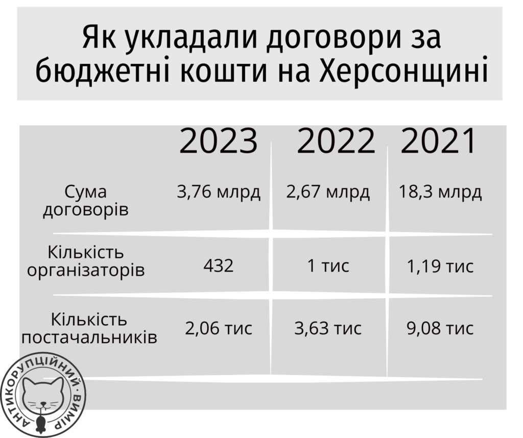 Попри те, що 8,5 місяців 2022 року Херсонщина майже повністю була окупована (перші звільнення громад почались у вересні 2022, правий берег повністю звільнили у листопаді 2022), а більша частина Херсонщини лишалась і лишається окупованою, за аналогічний період 2022 року (9 місяців) організаторів і постачальників торгів було більше, аніж у 2023-му. Хоча сума менша майже на мільярд. Якщо ж порівнювати з доокупаційним 2021-м, то тоді й надходження й витрати були значно більшими: угод за 9 місяців 2021-го на Херсонщині уклали на 18,3 млрд грн, тобто сума майже вшестеро більша за сьогоднішню, що цілком логічно.
