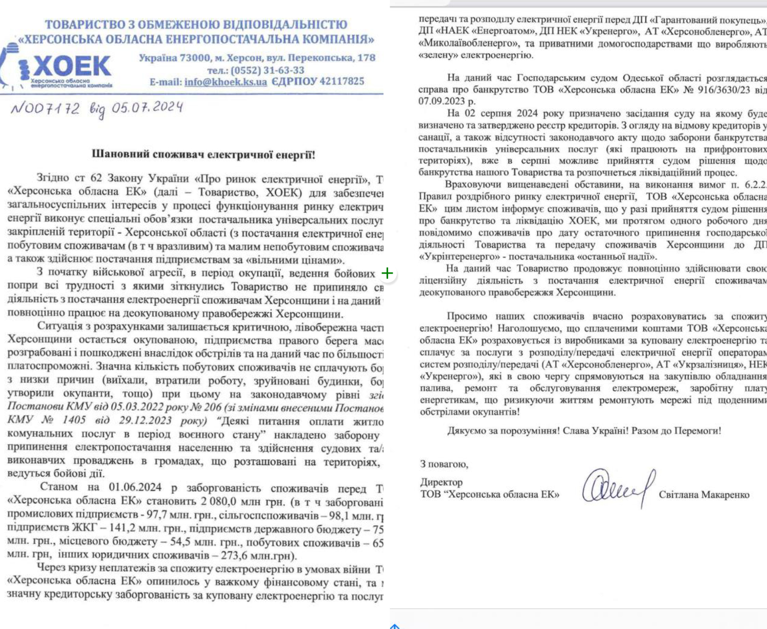 - На початку вересня 2023 року до жителів Херсона почали надходити листи від ТОВ «Херсонська обласна енергопостачальна компанія», в яких зазначалось про потенційне банкрутство компанії. Називалася орієнтовна дата припинення господарської діяльності – 19 листопада 2023 року.