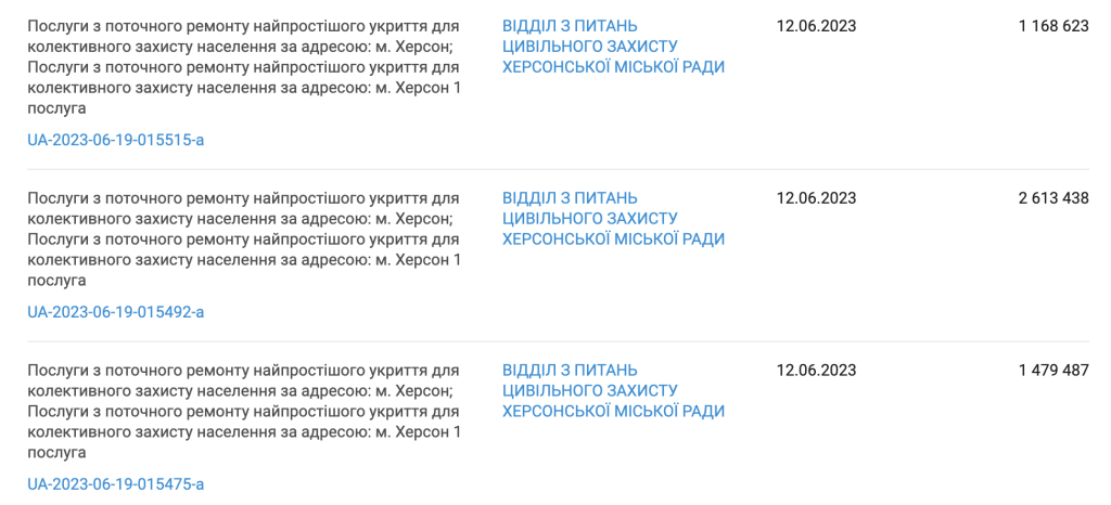 Тільки за червень ТОВ “Нью Білд Істейт” встигла виграти шість тендерів на ремонт укриттів у Херсоні. Тобто окрім вищезазначених 5 млн гривень, з бюджету витратили ще 5 261 548 мільйонів.