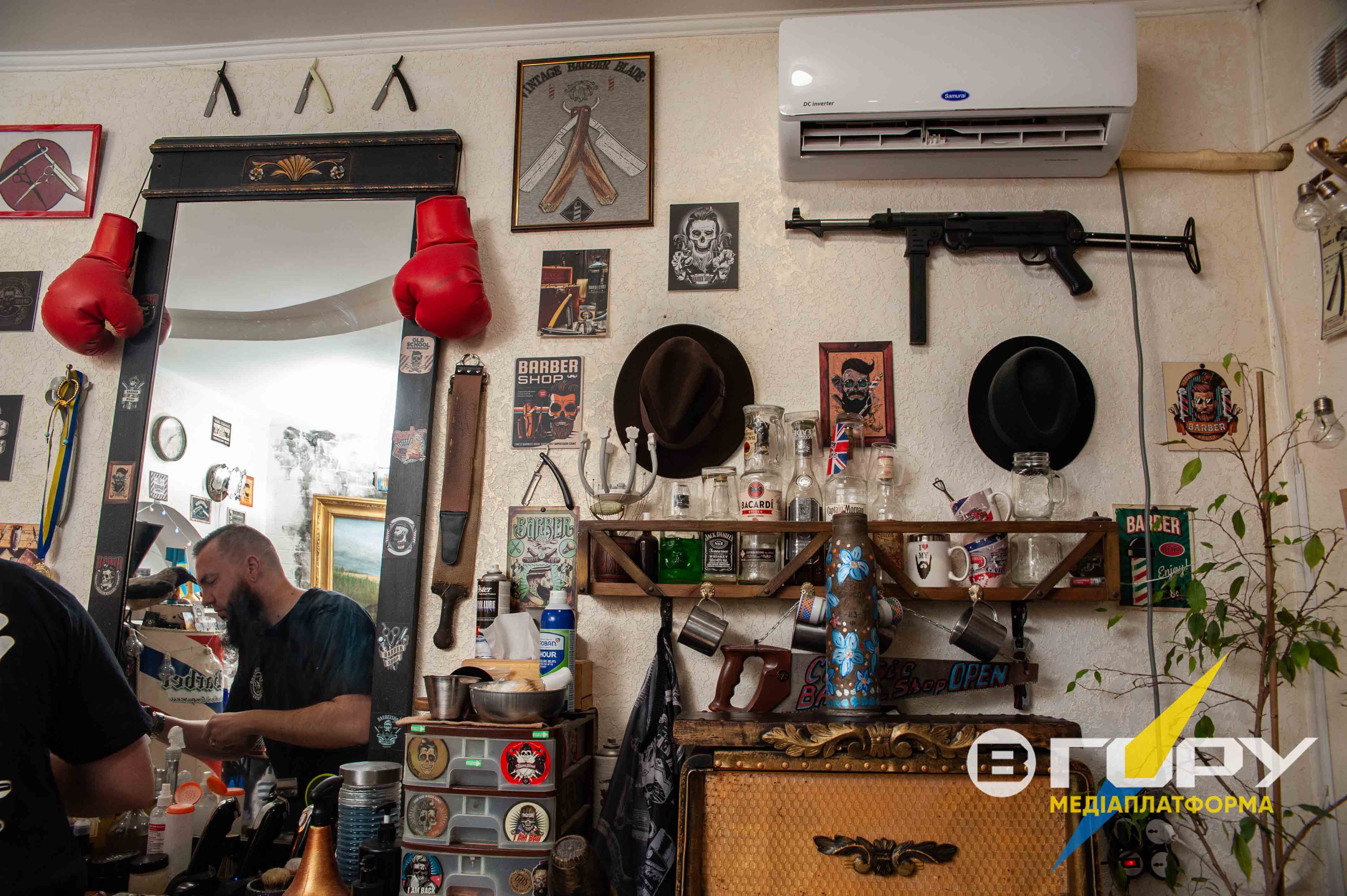“Чотири роки тому це була порожня кімната з голими стінами, - каже барбер Олександр, - всі деталі, як оформити інтер’єр, придумав сам. Всі меблі - столи, полиці, етажерки, стільці, які ви тут бачите - свого часу зробив мій прадід, ось цю морду від “Волги” для мене відрізали хлопці на авторозбірці”, - додає Олександр.