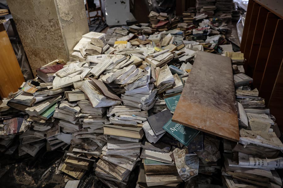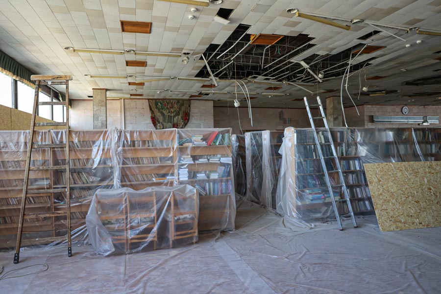 У центрі обслуговування людей з особливими потребами, розташованому на першому поверсі, було знищено понад 70 відсотків колекції книг шрифтом Брайля (яка була другою за значущістю в країні після Рівного). Деякі книги, що стояли на полицях у три ряди, продірявило наскрізь уламками. Інші – деформувалися від вологи та холоду, які проникали через вибиті шибки, поки приміщення розміновували.