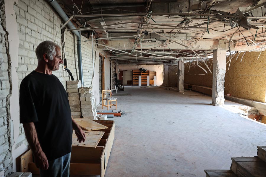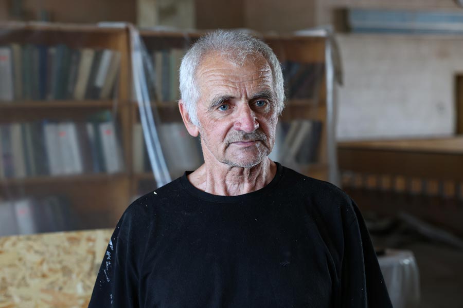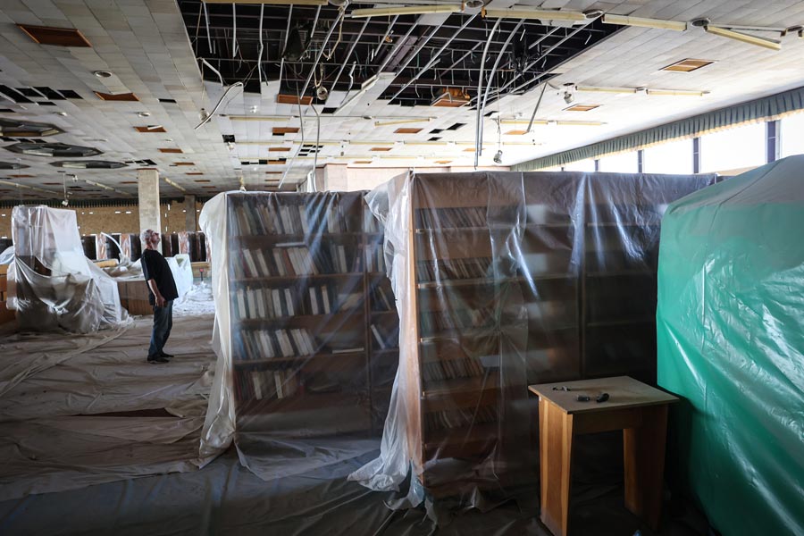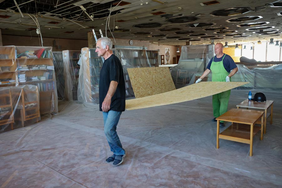 - Тут працюють наразі саме чоловіки, – пояснює Микола Степанович. – Взагалі в нашому колективі зараз близько 30 осіб працює, але через обстріли – дистанційно. А наша основна робота – розбирати завали, сміття, консервувати приміщення й захищати книги від вологи та перепаду температур. От зараз ставимо на вибиті вікна плити, стелажі плівкою обгортаємо.
