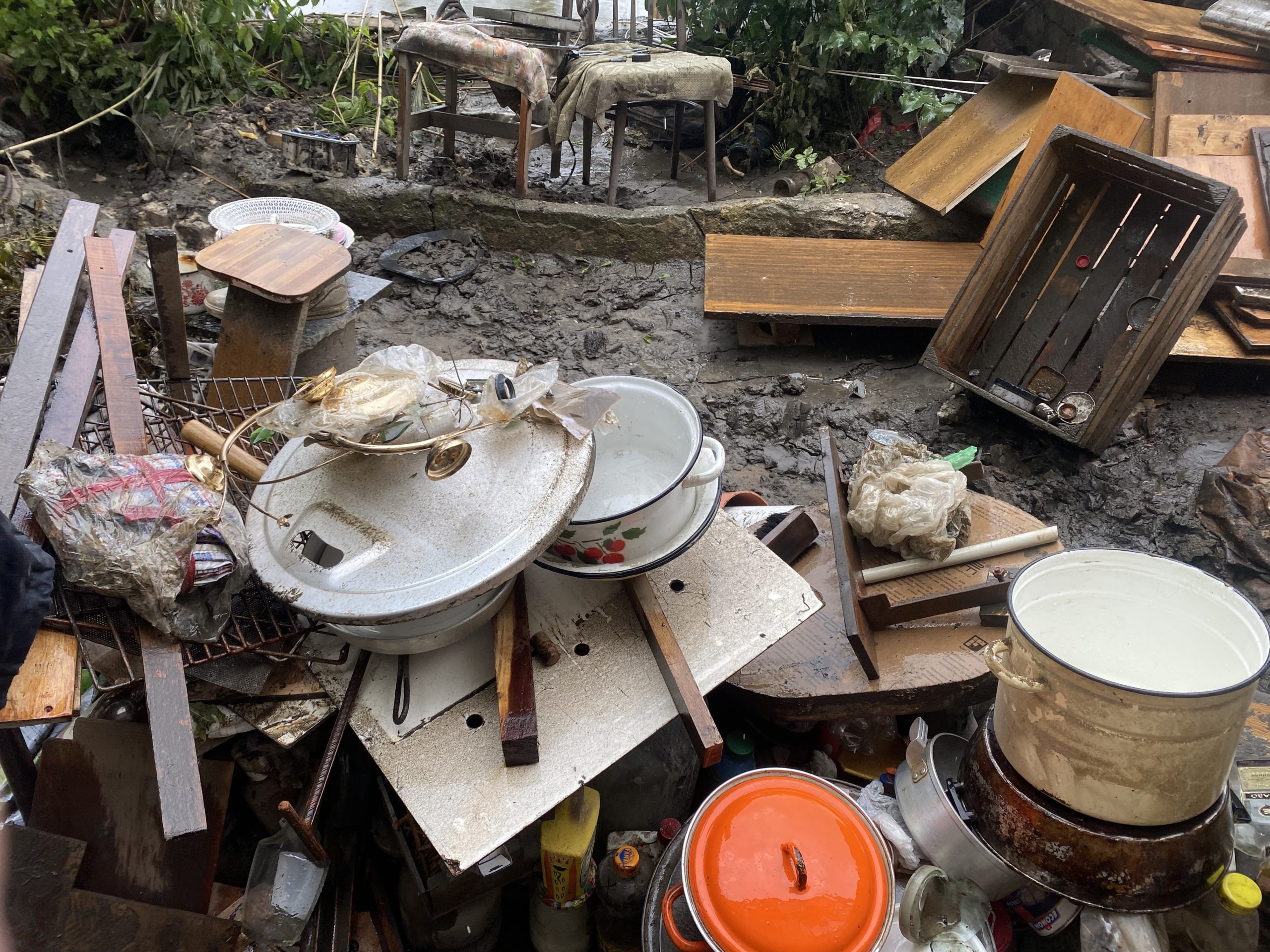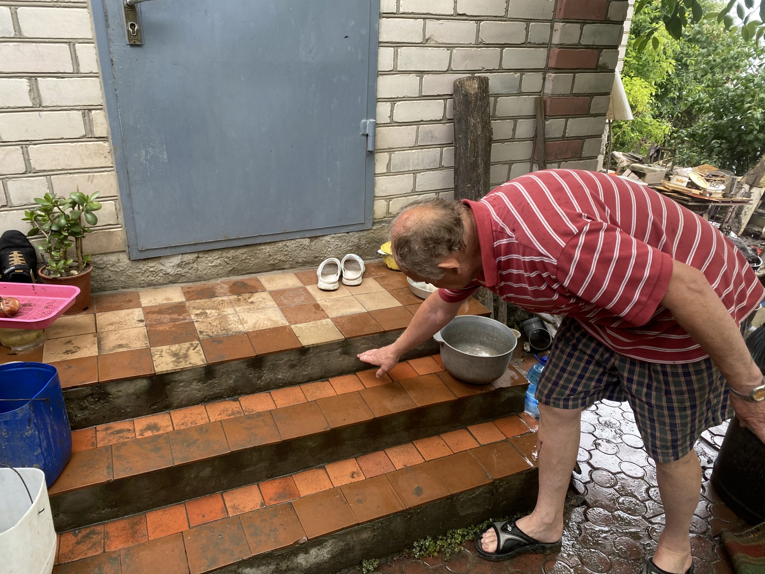 Така глина вкривала підлогу й двір ОлександраТри дні ношу, хочу трішки звільнити поверх, щоб сушилося.І тут виношу, а там ходжу документи оформлюю. Пішов, а це три-чотири години мінімум. Ось інструменти – залізо, його треба витерти, щоб не заіржавіло, – до них руки не доходять. Поки ще не можу повиносити. Й не хочеться, щоб пліснява завелася.