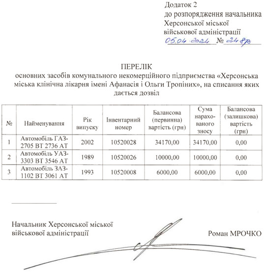 У Херсоні двом лікарням дозволили списати 6 автомобілів та ряд обладнання.Про це свідчить розпорядження № 248р начальника військової адміністрації громади Романа Мрочка з сайту міськради.Машини та обладання дозволили списати лікарням імені Карабелеша та Тропіних. Їх мають розібрати.Справні деталі, вузли та агрегати лікарні можуть використовувати в подальшому, а інше їм дозволили здати в якості металобрухту.