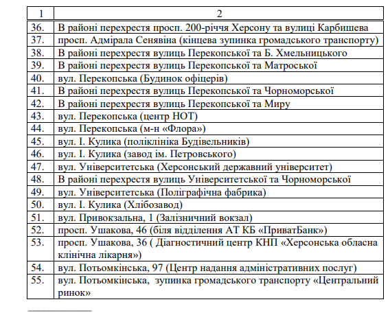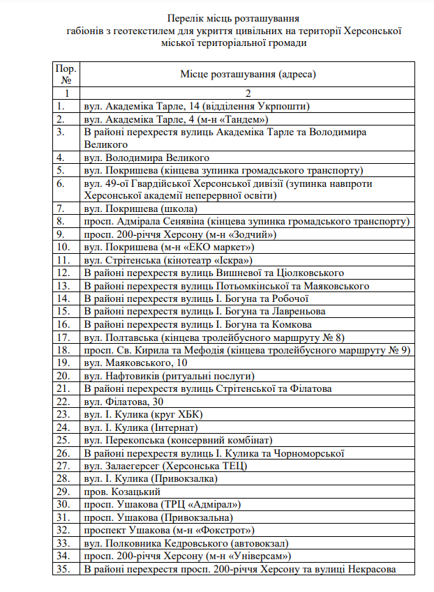 Відповідаючи на інформаційний запит журналістів нашого видання, керівництво Херсонської міської військової адміністрації надало повний список габіонів з піском, розташованих на території Херсонської громади. У ньому 55 об’єктів, що мають захищати херсонців від російських обстрілів. Ми публікуємо список цих укриттів, адже кожен херсонець має бути поінформований про розташування найближчих до нього захисних конструкцій.