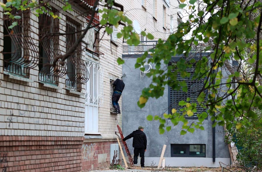 У цій будівлі три під'їзди, у кожному по десять квартир. Більшість людей виїхали як через окупацію, так і через обстріли росіян. Залишилося десь 20 – 23 мешканці. Вісімдесятирічна пані Олена живе на п’ятому поверсі. Знов і знов спускається сходами й виносить до сміттєвих баків відерцем розтрощені шибки, ледь стримуючи сльози.