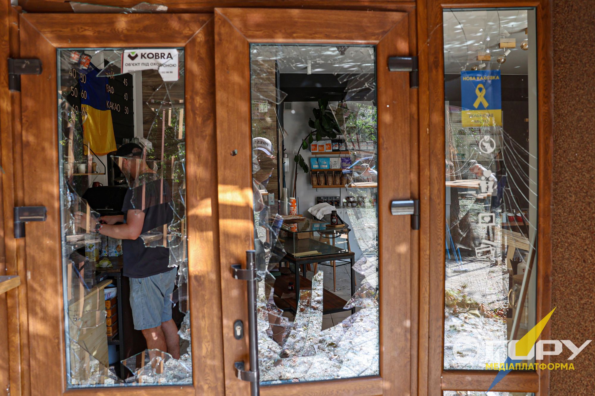 Прилетіло не в сам будинок, де наша кав’ярня, а поруч, на дорогу, – пояснює Олексій. – Але увесь фасад побило, скла й уламків багато було. Що в нас теж вхід та вікна зруйновані, повідомили сусіди, жителі цього будинку. О четвертій ранку змогли додзвонитися до нашої бухгалтерки, а вона потім – мені. Коли приїхали, крізь двері зайти не змогли. Їх заклинило. Так всередину заштовхнуло, що аж рама прогнулася й стеля над нею репнула. Заліз через вікно, бо скло вціліло лише в одній кватирці.