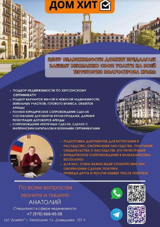 Він називає себе спеціалістом у сфері нерухомості євпаторійського ООО «ДомХит» і пропонує свої послуги «по всій території півострова Крим». Він обіцяє юридичний супровід, спокій при оформленні договорів і бонуси клієнтам.