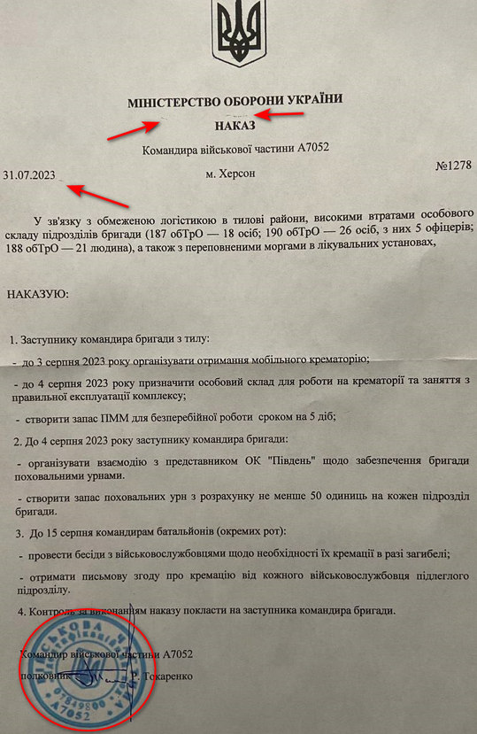 123-а бригада територіальної оборони, яка воює у Херсонській області, спростувала черговий фейковий “наказ” свого командира.Про це підрозділ повідомив у Facebook.Цього разу “наказ” командира бригади з Миколаївщини стосувався організації кремації загиблих бійців. Від себе можемо додати, що сліди втручання у фото “наказу” видно в районі печатки, дати та слова “наказ”.