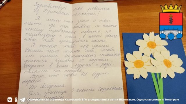 «Дорогі жителі Херсонської області! - написала учениця 4 класу. - Мені дуже шкода, що ви потрапили у цю страшну ситуацію. Я хвилююсь за вас! Я сподіваюсь, що ви зараз у безпеці і читаєте цього листа. Мені дуже хочеться вірити, що війна скоро закінчиться. І ви будете живі і здорові». Як рашисти змогли пропустити лист, де «спєциальная воєнная опєрация» називається війною, незрозуміло.