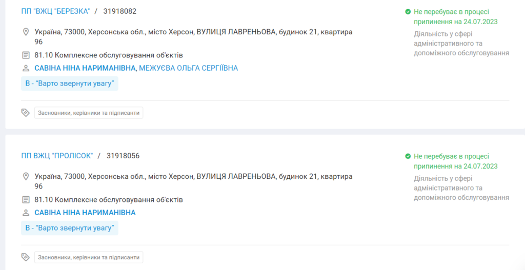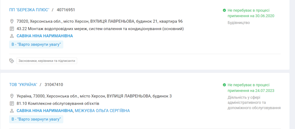 Ніна Савіна, яка народилась в Росії, у 2010 році балотувалась до Херсонської міської ради від Комуністичної партії України. У 2015-му йшла від «Самопомочі». Обидва рази не була обрана. Втім, потрапила до складу виконкому — оскільки Савіна займалась діяльністю, пов’язаною з утриманням будинків. Савіна неодноразово фігурувала у корупційних скандалах у Херсоні. Вона і досі офіційно очолює кілька підприємств у місті, які так чи інакше пов’язані з утриманням житлових будинків.