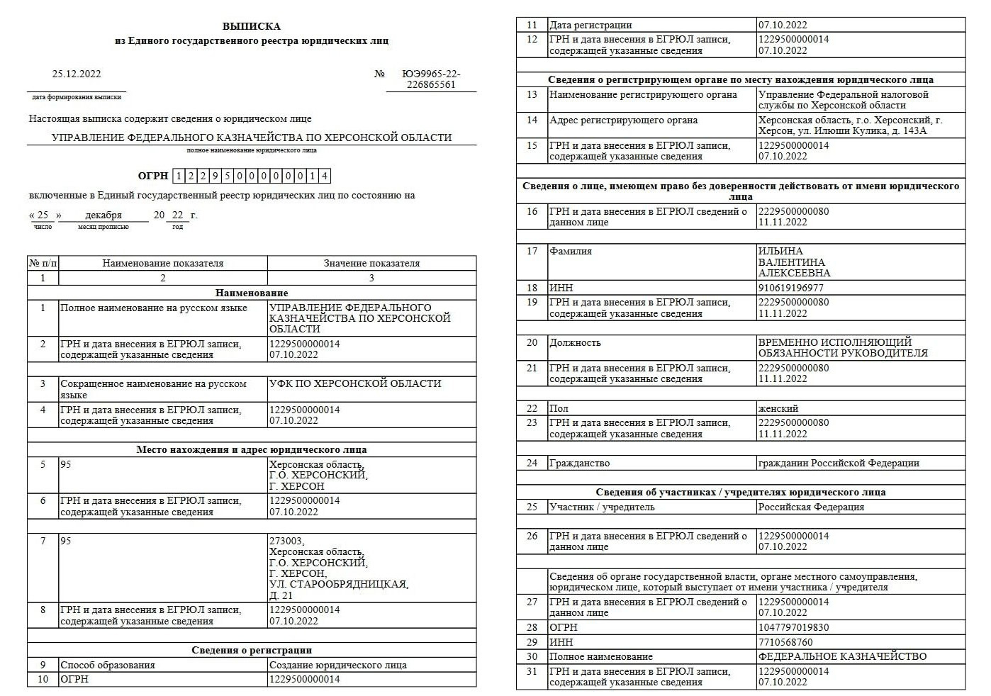 22 грудня минулого року Ільїна зареєструвала окупаційне казначейство в російському реєстрі юридичних осіб. Також підозрювана отримала російський паспорт.