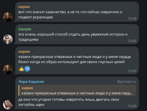 “Штаб” чулаківських “казаків”.Загалом чулаківські “казаки” зовсім не ті, хто “відважно і доблесно виконують свій обов’язок, як і їхні предки десятки і сотні років тому”, як про це пишуть російські ЗМІ. Чернишов і Томашев – просто аніматори, які використовуються росіянами для просування своїх наративів. Яких саме? На це питання можна відповісти, почитавши коментарі під публікацією про “казаків”. У них російські боти називають чулаківських зрадників “правжніми казаками”, на противагу Українському козацтву, що знаходиться “під владою нацистів”. Тобто місія загаданих зрадників очевидна – перекручування історії України, зокрема часів Війська Запорізького.
