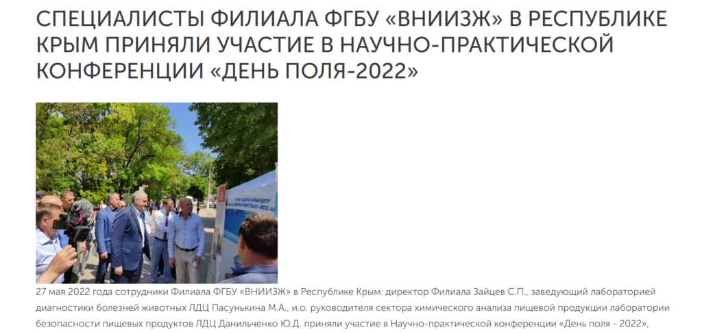 Page 1 / 9Zoom 100%У травні 2022 року Сєргєй Зайцев, тоді ще директор кримської окупаційної філії «ВНИИЗЖ» разом із так званим «головою» Криму Сергієм Аксеновим брав участь у конференції «День поля-2022» на окупованому півострові.