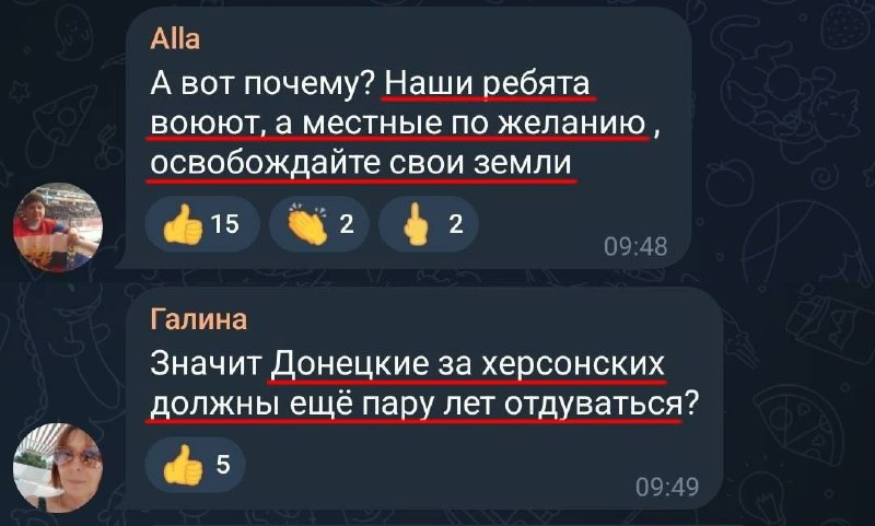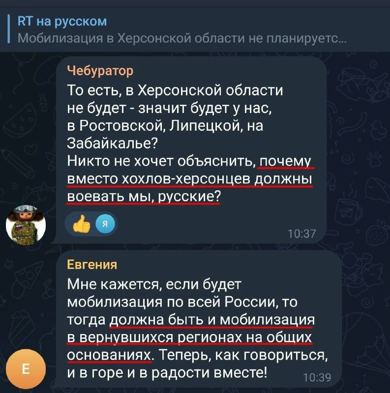 Додамо, що спростування сальдо про мобілізацію на Херсонщині викликало обурення в соцмережах, зокрема, серед росіян. Загальний меседж більшості коментарів: "чому жителі інших регіонів росії мають захищати Херсонську область?" (дивіться скріншоти). На реакцію рашистів звернув увагу Telegram-канал "Херсонщина моніторинг".
