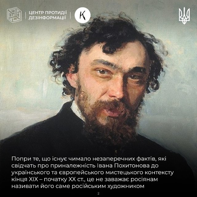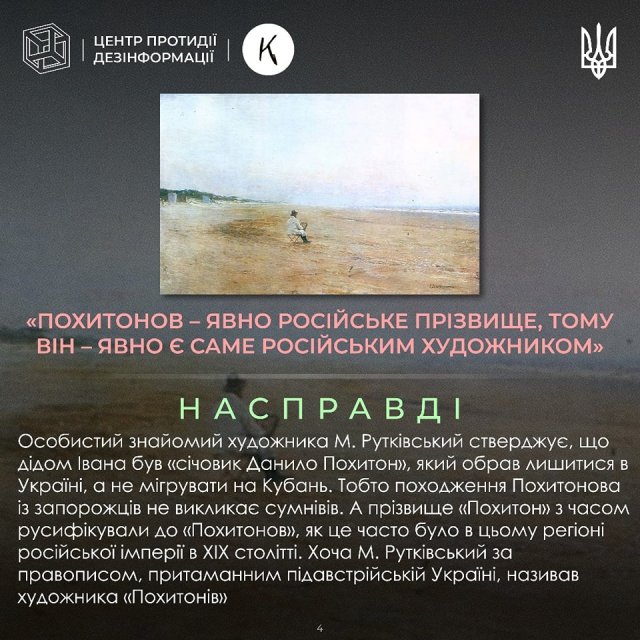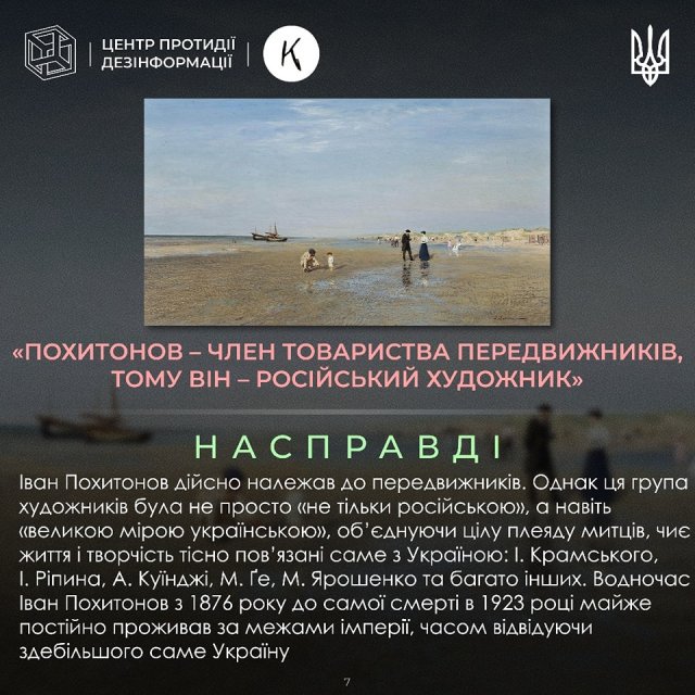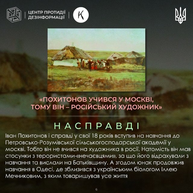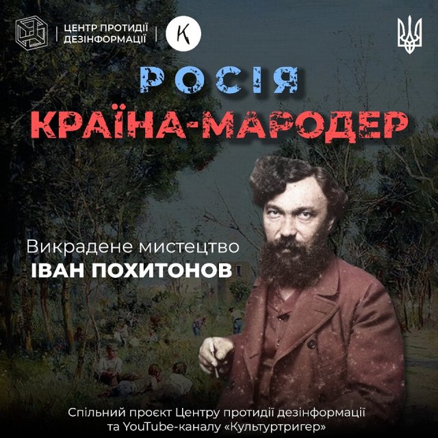 Тож до зображення викраденої окупантами мініатюри Івана Похитонова, що є фактом фізичного пограбування, додаємо інфографіку, яку створили Центр протидії дезінформації та YouTube-канал Культуртригер — про фейки, які просуває роспропаганда в намаганні привласнити українського художника інформаційно.
