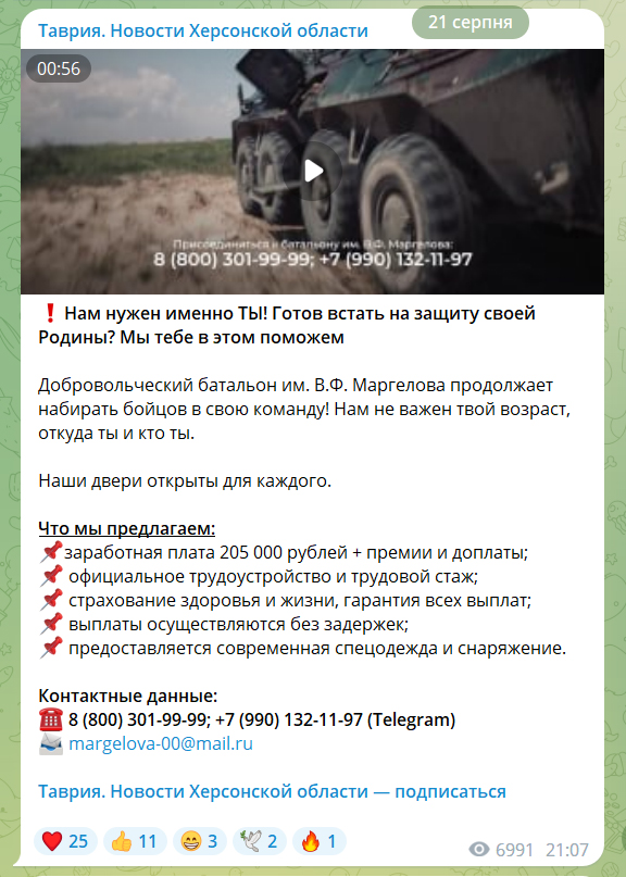 Підконтрольні російським окупантам пропагандисти стверджують, що в створений російськими окупантами «батальйон імені Маргелова» начебто подали заяви сотні мешканців окупованої частини Херсонської області.Зокрема, такі повідомлення розповсюджує херсонський прокремлівський телеканал «Таврія».Пропагандисти цитують російського сенатора Костянтина Басюка, який представляє окуповану частину Херсонщини в раді федерації РФ.На даний момент у Херсонській області немає планів мобілізації населення, але сотні чоловіків уже подають заяви на вступ до добровольчого загону №33 імені В.